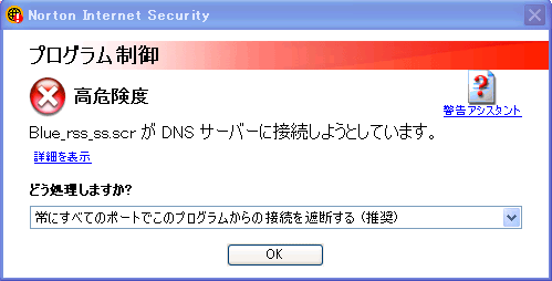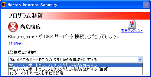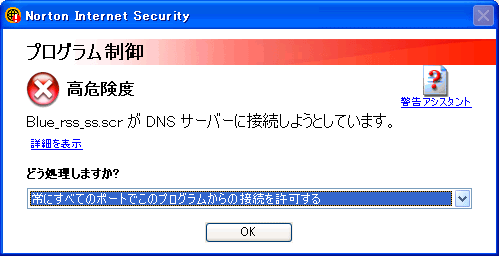この機能はネットワークに接続するので「ノートン インターネット セュリティ」などのセキュリティソフトの警告が出ます。