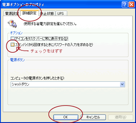 2.「詳細設定」のタブを開いて、「スタンバイから回復するときにパスワードの入力を求める」のチェックをはずします。